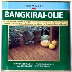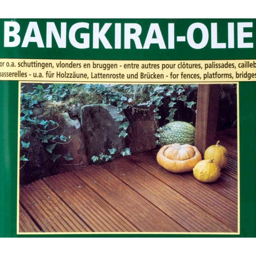 Bangkirai-Olie is watergedragen, bevat geen oplosmiddelen en is dus minder milieubelastend. Het product droogt snel, geeft een langdurige, waterafstotende bescherming en voorkomt vergrijzing en vervuiling. Het is speciaal ontwikkeld voor bijvoorbeeld schuttingen, vlonders, bruggen en andere buitenconstructies van deze keiharde hardhoutsoort.