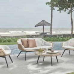 Zit je het liefst buiten met een hapje en drankje met het hele gezin of lekker rustig alleen dan is de loungeset Hummingbird echt iets voor jou! De Hummingbird lounge set is compleet met 2 prachtige stoelen, een bank en een tafel en natuurlijk voorzien van heerlijk comfortabele kussens. De Hummingbird loungeset heeft een mooie vormgeving waardoor die in elke tuin past. De Hummingbird is gemaakt van wicker, de poten zijn gemaakt van aluminium.