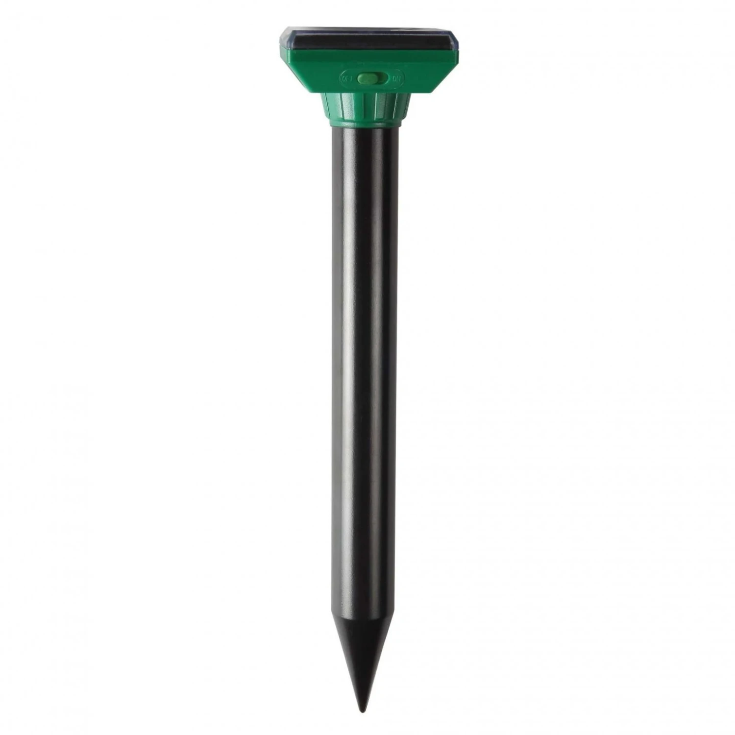 Ultrasoon apparaat op zonnen-energie. Het apparaat produceert elke 30 seconden een geluid dat woelratten en mollen verjaagt.