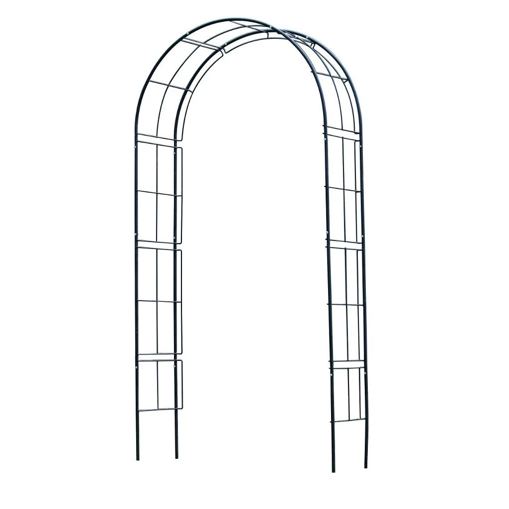 Boogvormige rozenboog van verzinkt staal met een zwarte epoxycoating.