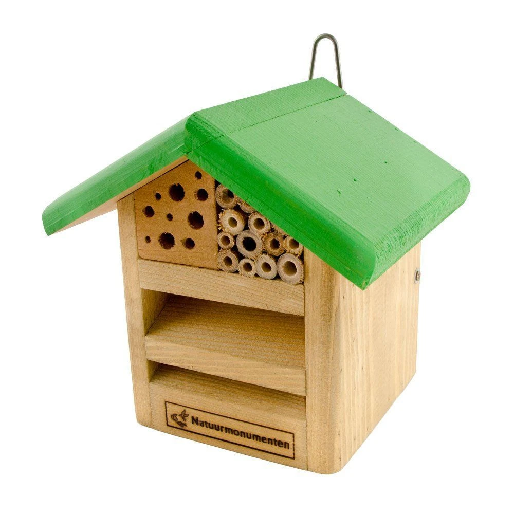 Bijen en lieveheersbeestjes zijn een belangrijk onderdeel van ons ecosysteem. Ze helpen bij de bestuiving van planten en functioneren als natuurlijk ongediertebestrijding. In het bovenste deel zullen solitaire bijen hun eitjes leggen. De horizontale schuine gleuven maken het insectenhotel geschikt voor lieveheersbeestjes.